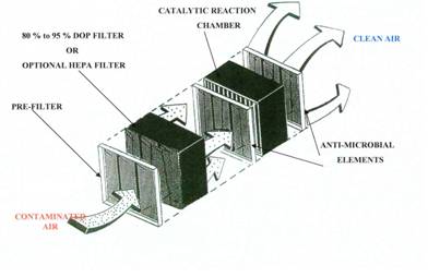 filter), a set of anti-microbial elements, a catalytic reaction chamber and a
